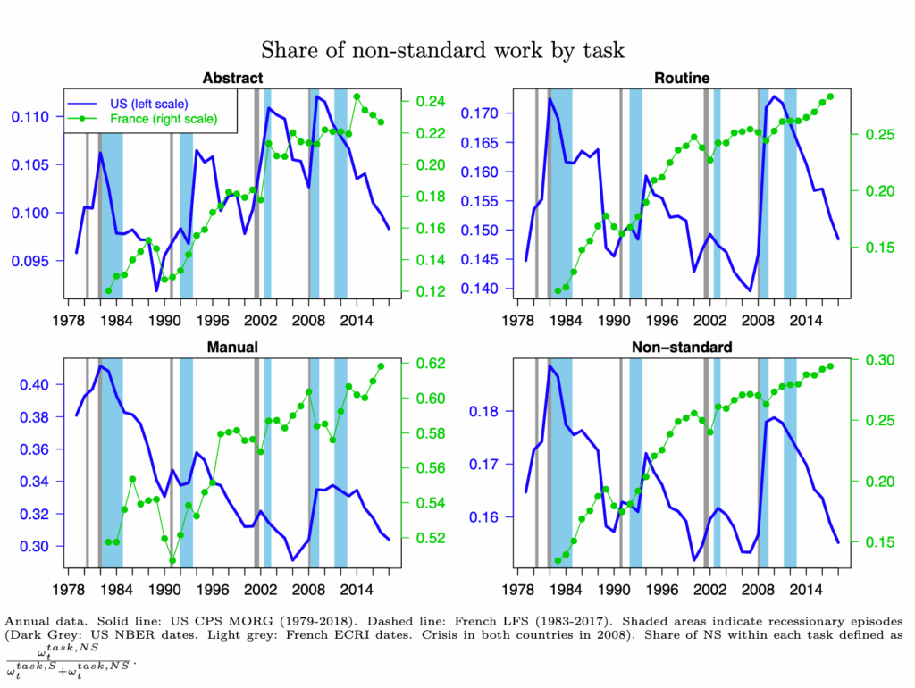 Summary: The project examines the long-term polarization of employment observed since the 1980s, characterized by the growth of high- and low-skilled jobs and the decline of routine middle-skill occupations. It first documents this phenomenon, focusing on its geographic dimension in Île-de-France and the rise of non-standard employment forms. It then analyzes how employment polarization interacts with technology and wage inequality, including productivity-wage gaps and intergenerational disparities. Finally, the project explores the social and institutional consequences of polarization, particularly its effects on gender inequalities, family structures, and political behavior.